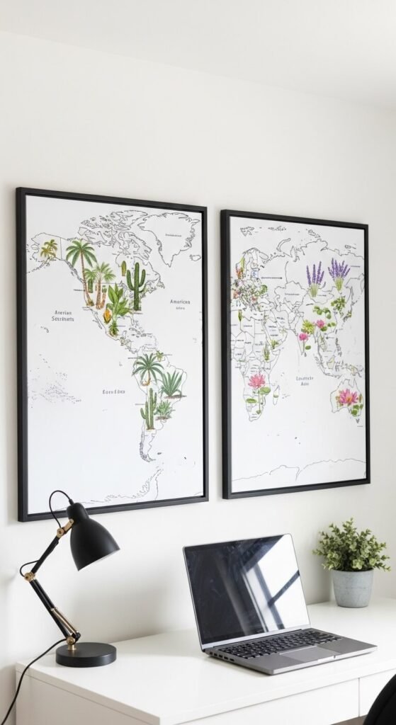 Botanical habitat maps combine geography and botanical illustration in a single print — showing where specific plant families originate across the world. These prints work well in home offices, studies, and children’s rooms where the educational quality adds value. Many illustrated plant world maps are available as digital downloads for $5–$12. Larger printed versions — 24×36 inches — make a strong statement on a study or library wall. This is a botanical print with a specific point of view: it tells a story about where plants come from rather than simply depicting them. That context makes these prints more interesting the longer you look at them.