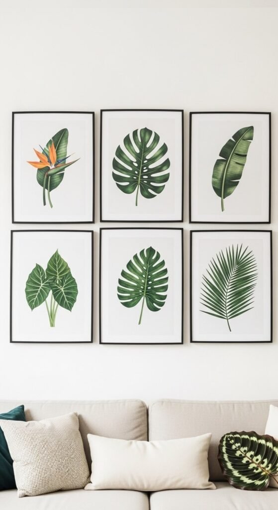 A tropical leaf gallery wall groups prints of large-leaf tropical plants into a single cohesive display. The visual impact comes from scale contrast — a wide banana leaf beside a detailed monstera beside a graphic palm frond. Keep all frames matching — same thin black or natural wood profile — so the variety in the prints themselves reads as intentional rather than random. Free tropical leaf illustrations are available from botanical archives. Alternatively, photograph your own tropical houseplants against a white background and print the images as art. A six-print gallery wall with printed and framed images costs $30–$60 total.
