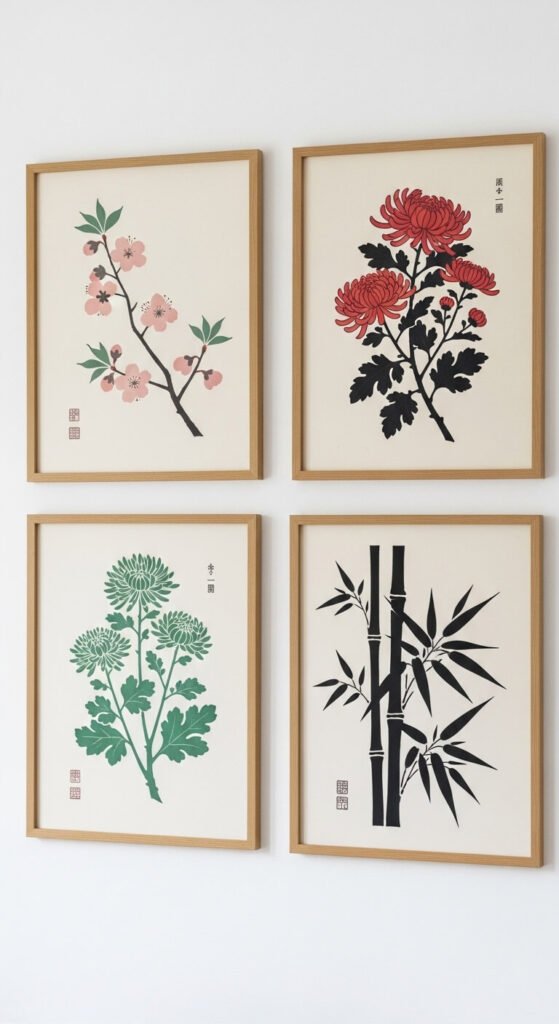 Japanese woodblock botanical prints bring a completely different aesthetic tradition to botanical decor — flat planes of color, strong ink outlines, and a graphic clarity that Western botanical illustration rarely achieves. Cherry blossom, chrysanthemum, wisteria, and bamboo are the most common subjects. Many historic Japanese woodblock prints are in the public domain and freely downloadable in high resolution from museum digital archives. Print on slightly warm paper to complement the limited color palettes. Frame in natural bamboo or simple black frames. A set of three creates a cohesive display that feels considered and culturally specific rather than generically decorative.