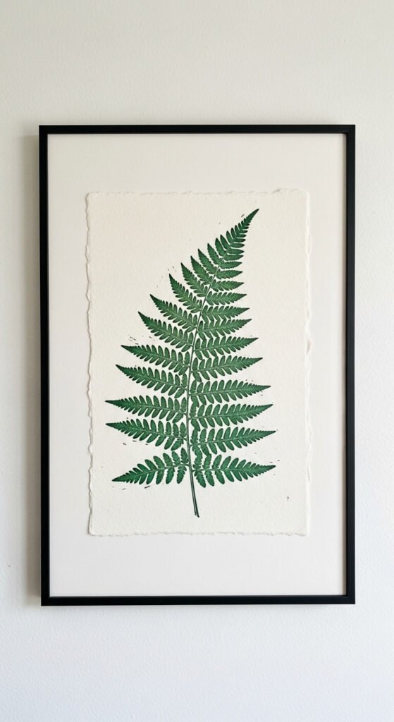 A lino-cut botanical print is a handmade print you carve and print yourself using a lino block and water-based printing ink. Carve a fern, leaf, or simple flower form into the block and press onto paper to create prints in any quantity. Lino-cutting kits cost $12–$20 and include the block, carving tools, and basic ink. Use handmade paper with natural rough edges for the most distinctive result. The slight variations in ink coverage from one print to the next mean each one is technically unique. Frame in a simple mat and frame. The tactile quality of a hand-printed lino image is something no digital print can replicate.
