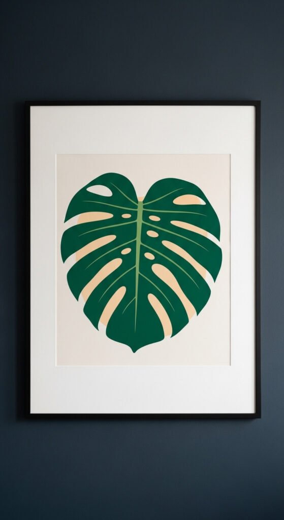 A bold color monstera print works particularly well on dark or deeply colored walls where a natural cream-and-green palette pops clearly. A single deep emerald leaf on cream paper in a wide-mat frame against a navy or charcoal wall creates a graphic, high-contrast display. The monstera is one of the most recognizable plant silhouettes and consistently reads well at large scale. Monstera digital art prints are widely available for $4–$10 on Etsy. Print at A2 or larger. Mount with a wide mat to give the image more presence. This is the boldest, most graphically driven botanical print approach in this guide.