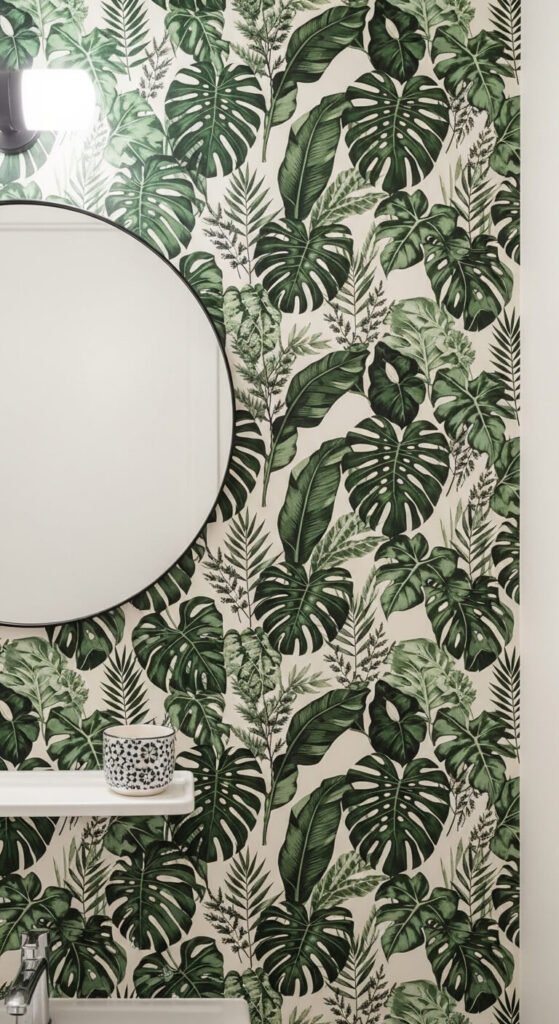 A botanical wallpaper panel on a single accent wall delivers the visual impact of a full botanical mural without wallpapering an entire room. Apply botanical print wallpaper to just one wall — behind a bed, in a bathroom, or at the back of a bookshelf — and leave the remaining walls plain. This approach uses less paper, costs less money, and creates a more considered result than full-room botanical wallpaper. Peel-and-stick botanical wallpaper is widely available from $20–$50 per roll and requires no paste or professional installation. A single bathroom or bedroom accent wall typically uses one to two rolls.