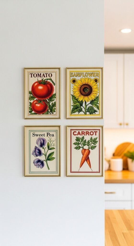 Vintage seed packet illustrations are a form of botanical art that doubles as kitchen decor with a sense of humor and history. Pre-1920s seed catalog and packet illustrations used detailed botanical artwork to sell seeds — the results are often beautiful, specific, and completely charming. Many are in the public domain and freely available from agricultural library archives. Print four or six in matching sizes on warm cream paper. Frame in brass or warm wood frames. A set of four in a kitchen or dining room costs under $30 total and generates more conversation than most conventional botanical prints because the subject matter is specific and recognizable.