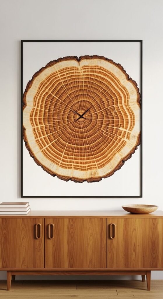 A tree ring cross-section print is a botanical decor choice for people who find standard leaf prints too predictable. The concentric growth rings of a tree trunk are both scientifically interesting and visually striking — the warm amber and brown tones work well in rooms with wooden furniture and natural materials. High-resolution photographs of polished wood cross-sections are available from stock photo sites, or source a real thin-cut wood slice and photograph it yourself. Print at large scale — 20×20 inches minimum — for the ring detail to read clearly. This print type suits a home office, living room, or hallway with a strong natural material aesthetic.