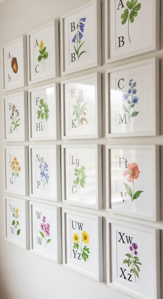 A botanical alphabet print set gives a children’s room wall both educational content and genuine botanical art. Each of the 26 prints pairs a letter with a plant — acorn, bluebell, clover, dandelion — illustrated in soft watercolor. Complete digital sets are available on Etsy for $8–$15 and include all 26 prints sized to print at home. Frame all 26 in matching simple white frames and arrange in a grid. The full grid fills a significant wall area and costs $30–$50 total. This is one of the few botanical print approaches that is equally appropriate for a child’s room and for an adult space — the botanical quality stands independently of the alphabet context.