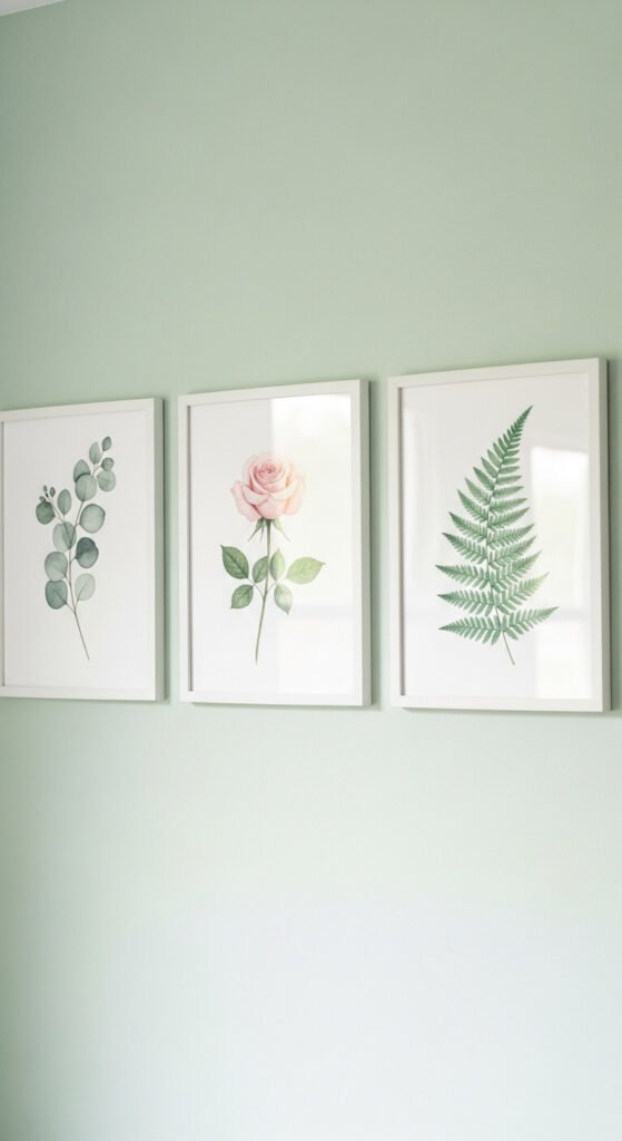 Watercolor botanical prints use soft, diffused color to depict plants in a way that feels delicate rather than graphic. Blush roses, eucalyptus sprigs, and fern fronds in muted watercolor tones work especially well in bedrooms, bathrooms, and reading corners. Many watercolor botanical artists sell affordable digital downloads on Etsy for $3–$8 per print. Download, print at home or at a copy shop, and frame. A set of three matching watercolor prints in white frames costs under $30 total. Hang in a horizontal row at eye level for the cleanest, most considered display approach.