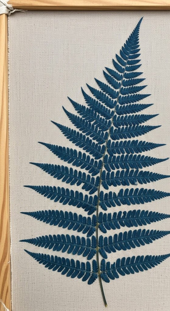 A cyanotype or ink-print fern on fabric is a DIY botanical print you make yourself using real plant material. Cyanotype printing uses UV-sensitive solution on fabric or paper — place a fern frond on the treated surface, expose it to sunlight for a few minutes, and rinse to reveal a detailed blue-white plant silhouette. Cyanotype kits cost $15–$25 and include enough solution for 20–30 prints. Stretch the finished fabric over a canvas frame for a piece that looks completely original. No two cyanotype prints are identical. This is the most hands-on botanical print project in this guide — and produces genuinely one-of-a-kind wall art.