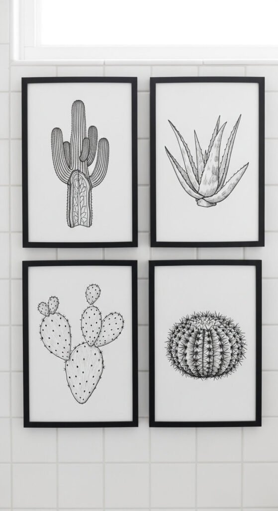 Black-and-white cactus and succulent prints work particularly well in bathrooms and minimal interiors where a clean, graphic aesthetic reads better than color. The fine line art style — used in classic botanical illustration — shows the structure of each plant clearly: the ribbing on a barrel cactus, the geometric rosette of a succulent, the cross-section of a prickly pear. Free cactus illustrations are widely available from botanical archives and plant illustration databases. Print four in matching sizes and frame in identical black frames in a two-by-two grid. Clean, affordable, and indefinitely current as a design choice.