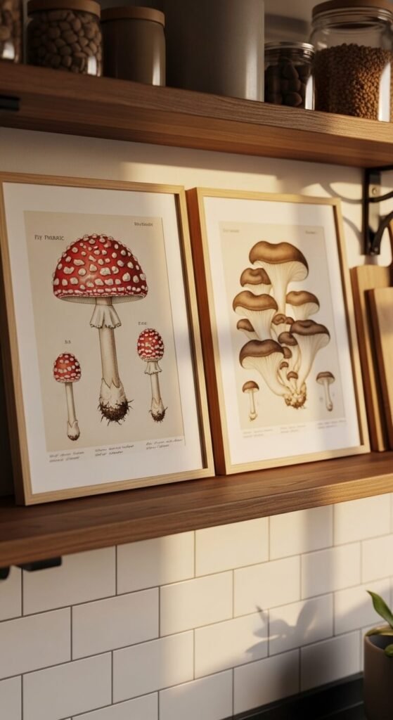 Mushroom and fungi botanical prints are among the most interesting and underused botanical print subjects. Vintage mycology illustrations from the 19th and early 20th centuries show mushrooms in extraordinary detail — cross-sections, spore patterns, cap undersides — often with handwritten species notes. These are freely available from public domain archives and look striking in a kitchen, study, or bathroom. A fly agaric or oyster mushroom illustration has a visual interest that standard leaf prints do not. Print on cream-toned paper to preserve the aged quality of the original source material. Frame in simple warm wood tones.
