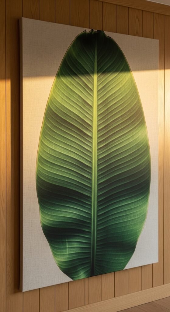 A tropical leaf print on linen canvas has a warmth and softness that standard paper prints cannot match. The texture of the linen adds a tactile quality to the image — visible under raking light — that makes the print feel more like original art. Print a close-up photograph of a banana leaf, monstera, or palm frond on canvas through an online printing service. A 20×24-inch canvas print costs $25–$45. Leave the edges raw for a contemporary look, or stretch over a wooden frame. Hang without a glass frame for a relaxed, studio-art feel. The natural green tones work well against white, warm white, or sage walls.