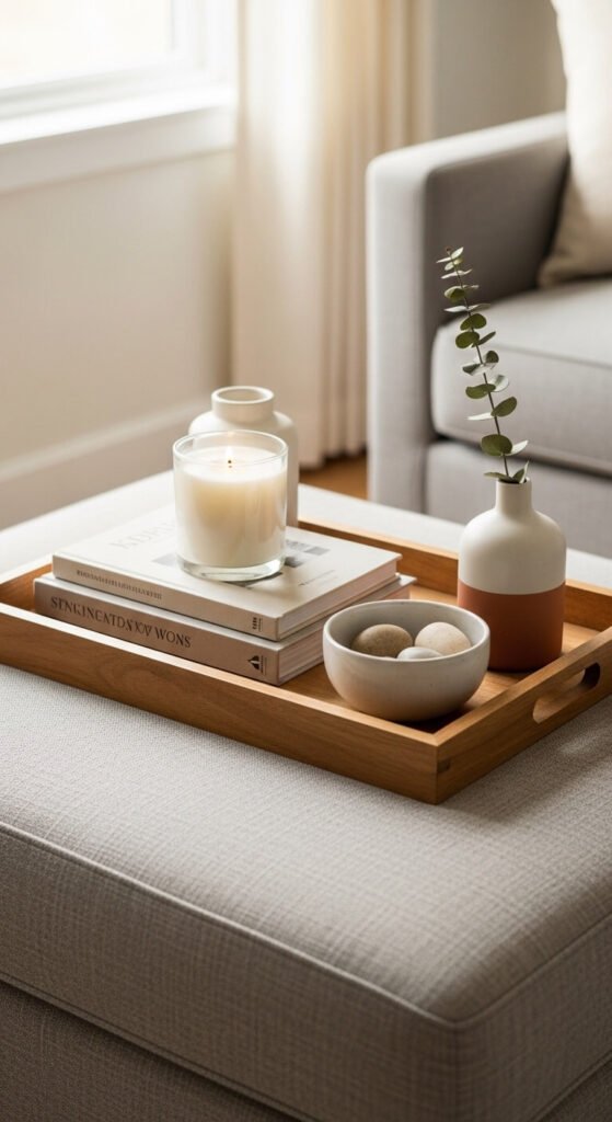 A styled tray on a coffee table or ottoman creates an immediate focal point for the living room and keeps frequently used objects — a candle, a remote, a small plant — from looking scattered across the surface. Use a tray that is approximately one-third to one-half the length of the coffee table surface so the remaining table surface is visible on both sides. Group objects in a loose triangle with the tallest item at the back, the mid-height items in the center, and a low flat item at the front. A wooden, rattan, or marble tray costs $15 to $50 from most home stores. The objects inside the tray should total no more than five to keep the display from feeling cluttered.