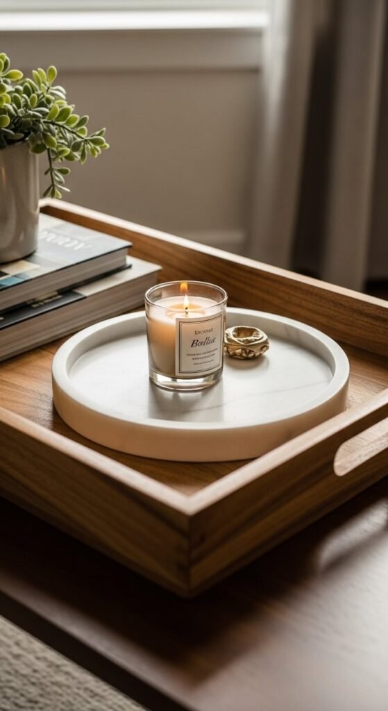 Placing a smaller tray inside a larger tray creates a layered, nested composition with two distinct display zones — the inner tray becomes a focused vignette within the broader outer tray arrangement. Use contrasting materials for the two trays — a large rectangular wooden tray with a small round marble or brass tray inside it creates visual contrast through both shape and material. The objects in the inner tray should be the most decorative — a candle, a crystal, a small sculpture. The objects in the outer tray surrounding it can be more practical — books, a coaster, a plant. This two-layer approach creates depth and a sense of editorial intention that a single flat tray cannot match.