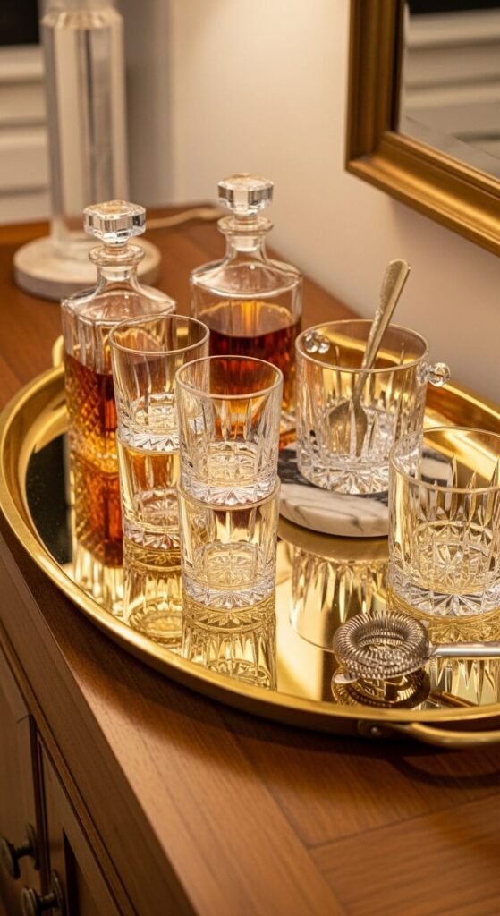 A large brass or gold tray on a sideboard creates a home bar display without requiring a dedicated bar cart — it groups all the serving essentials into a contained, beautiful arrangement that looks like a purposeful bar vignette rather than a random collection of bottles. Use a large oval or rectangular brass tray — at least 16 inches in the longest dimension — to hold two decanters, four glasses, and one or two additional bar accessories. The brass surface reflects the crystal and glass above it, multiplying the sparkle and visual richness of the display. A large brass tray costs $20 to $60 from most home stores and online retailers. This approach suits dining rooms, living rooms, and home office sideboards equally well.