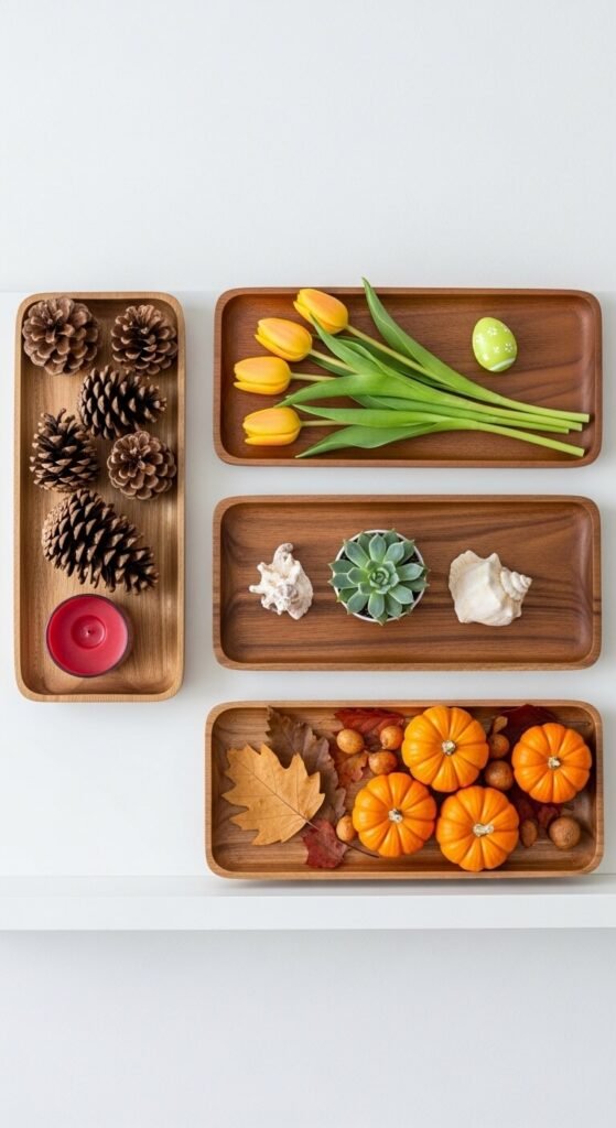 Using the same tray year-round and simply swapping its contents with the season is the most cost-effective way to keep any surface looking current without buying new decor throughout the year. Keep a permanent tray on each key surface — coffee table, console, kitchen island — and plan four seasonal swaps: pine cones and a candle for winter, tulips and a small ceramic for spring, a succulent and a seashell for summer, mini pumpkins and dried leaves for autumn. Seasonal objects from a grocery store or craft store cost $3 to $10 per season. The tray is the constant; the contents are the change. Four seasonal refreshes cost less than $40 total for the entire year.