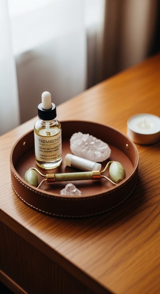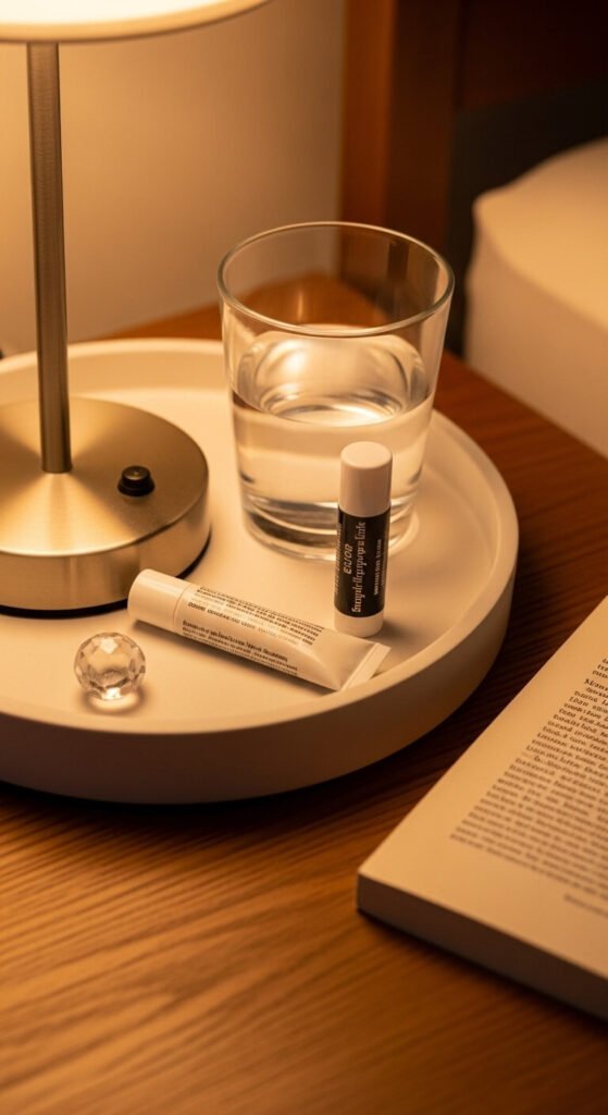 A nightstand tray styled around a morning skincare or wellness ritual turns a functional routine into a beautiful daily experience — the objects needed each morning are grouped, visible, and aesthetically pleasing rather than scattered in a drawer or crowded on a flat surface. Group five to six items used in a specific morning order — facial oil, a jade roller, a lip balm, a face mist — in a small leather or ceramic tray so the ritual objects are always in place and always visible. A small round leather tray costs $10 to $25 from most home or stationery retailers. The ritual objects inside the tray give the nightstand a personal, intentional character that purely decorative styling cannot replicate.