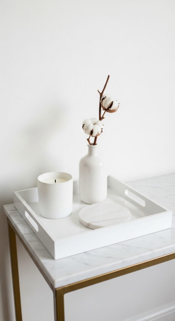 A white tray on a white surface relies entirely on material and texture variation rather than color contrast to create visual interest — and when done well, this monochromatic approach produces one of the most sophisticated and quietly confident tray displays possible. Use objects with as much texture variety as possible — a matte ceramic candle, a glossy lacquer tray, a rough marble coaster, a cotton stem — so the eye moves between surfaces rather than resting on a single undifferentiated white plane. This approach works best in rooms with a clean, minimal, or Scandinavian aesthetic where the restraint of an all-white palette is the design intention rather than an accident of limited options.