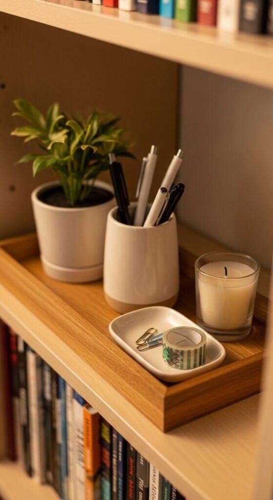 A tray placed on a bookcase shelf functions as a portable, self-contained mini-display that organizes and groups the small objects on that shelf into a contained vignette. Use a tray that fits within the shelf depth without overhanging — typically 10 to 12 inches deep for standard bookshelves. Group a small plant, a pencil holder, a tiny dish, and a short candle inside the tray. The tray prevents these objects from visually competing with the books behind them by creating a distinct layer of space within the shelf. A small rectangular bamboo or wooden tray costs $8 to $18 from IKEA, Amazon, or most office and home stores.