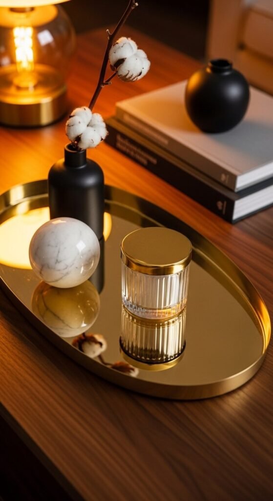 A gold or brass tray on a dark wood or dark marble surface creates one of the most visually dramatic tray displays available — the warm metallic sheen against the deep background tone produces a luxurious contrast that reads from across the room. Choose objects with strong material variation to place inside a gold tray — a white marble sphere, a clear glass candle, a black bud vase — so the gold frame is surrounded by contrasting textures that each reflect differently against the metallic surface. A large oval brass tray costs $20 to $60. The three to four objects inside the tray should include at least one white or light-colored object to provide visual contrast against the dark table surface below.