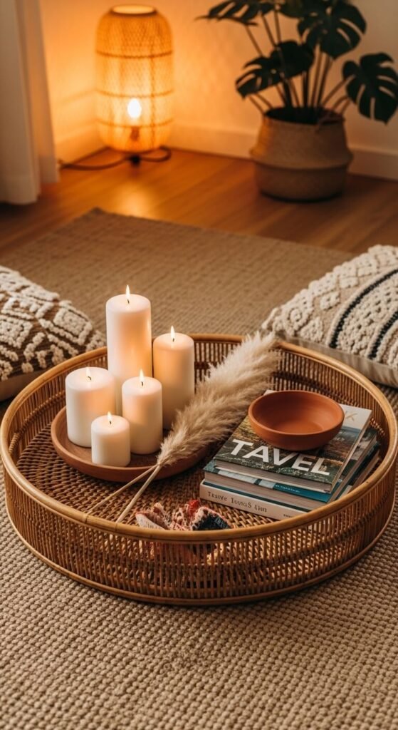 A large round rattan tray on the floor — used as a low, bohemian coffee table surface — is one of the most casual and characterful tray placements available, creating a defined display zone directly on a rug without requiring any furniture. Use a rattan tray at least 18 to 24 inches in diameter for a floor placement so it provides enough display surface for five to six objects at the comfortable viewing scale of floor-level seating. A large round rattan tray costs $20 to $50 from most home and discount retailers. Floor cushions arranged around the tray complete the low-level seating setup. This works particularly well in rooms with jute or sisal rugs where the natural material of the tray coordinates with the floor texture.
