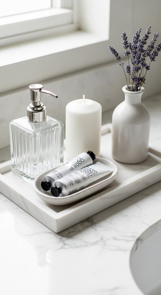 A small tray on the bathroom counter groups daily-use items — soap dispenser, hand cream, a candle — into a contained display that transforms a functional counter from cluttered to intentionally styled. Keep the tray small — 8 to 12 inches wide — so it does not consume the entire counter surface. Choose a tray material that complements the existing bathroom hardware — marble or white ceramic for a clean spa look, brass or bamboo for a warmer aesthetic. A small marble or ceramic bathroom tray costs $10 to $30 from most home stores. The four to five objects inside the tray should all be items used daily — styling a bathroom tray with purely decorative objects that have to be moved for practical use defeats the purpose.