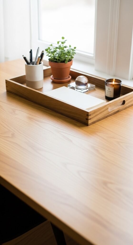 A tray on a home office desk corrals the decorative and functional desk accessories — a pen cup, a small plant, a candle, a paperweight — into a contained display at the back of the desk while leaving the primary working surface completely clear. Position the tray at the back edge of the desk rather than in the center so it does not encroach on the active work zone. A large rectangular wooden or leather desk tray costs $15 to $40. The four to five objects inside should be items that belong at the desk — a working pen, a functional small plant, a real candle — so the tray functions as an organized desktop accessory zone rather than a purely decorative distraction.