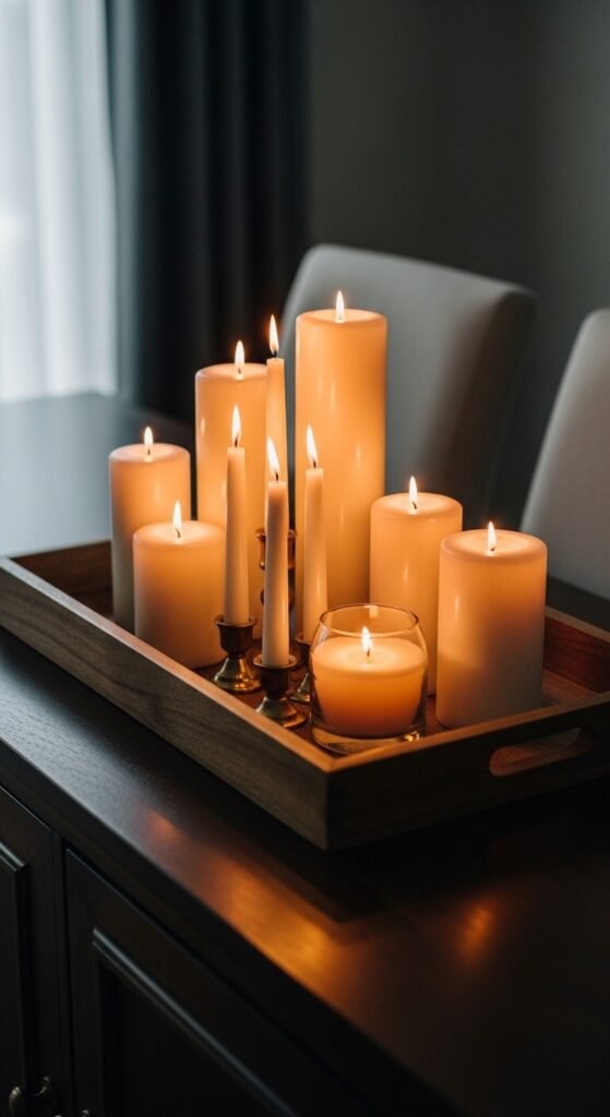 A tray used specifically as a containment zone for a candle cluster is one of the most practical and safest ways to display multiple candles together — the tray catches any wax drips, prevents candles from tipping onto a bare surface, and creates a defined display that looks intentional rather than hazardous. Use candles of dramatically different heights within the cluster — a 12-inch pillar beside a 4-inch votive beside an 8-inch taper — for the most visually dynamic composition. A large wooden serving tray from a thrift store or kitchen store costs $5 to $20. The candles themselves from a variety pack cost $10 to $25 for a full mixed-height cluster.