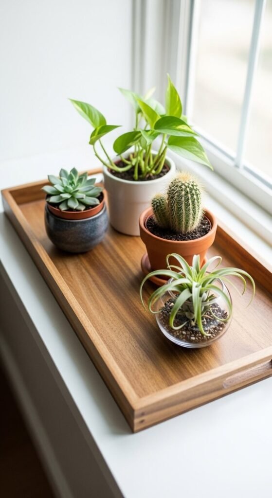 A tray used to group small potted plants together creates a unified mini-garden display rather than scattered individual pots — and catches excess water during watering, protecting the surface beneath from moisture damage. Use a waterproof or sealed tray — sealed wood, metal, or ceramic — so water does not seep through the tray base onto the surface below. A waterproof wooden or metal tray costs $15 to $35. Group plants that share similar light and watering requirements within the same tray for practical care. A window ledge plant tray with four small plants costs $25 to $50 total including plants and containers. Vary pot materials — terracotta, ceramic, glass, and metal — for the most visually interesting grouped plant display.