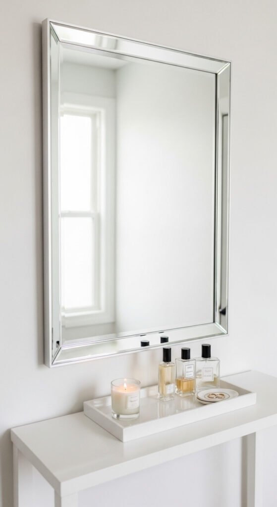 A mirrored tray on a bedroom vanity groups perfume bottles, jewelry dishes, and small beauty items into a luxurious, hotel-dressing-table display where the mirrored base reflects and multiplies the beauty of the objects grouped on top of it. Perfume bottles are inherently beautiful objects — their varied glass forms, heights, and color work as decorative arrangements in their own right when grouped on a mirrored surface. Use a mirrored or glass tray specifically for this purpose — the reflection adds a dimension of sparkle that a wooden or marble tray cannot replicate. A small mirrored vanity tray costs $15 to $40 from most home and beauty retailers. Group bottles by height — tallest at the back, smallest at the front.
