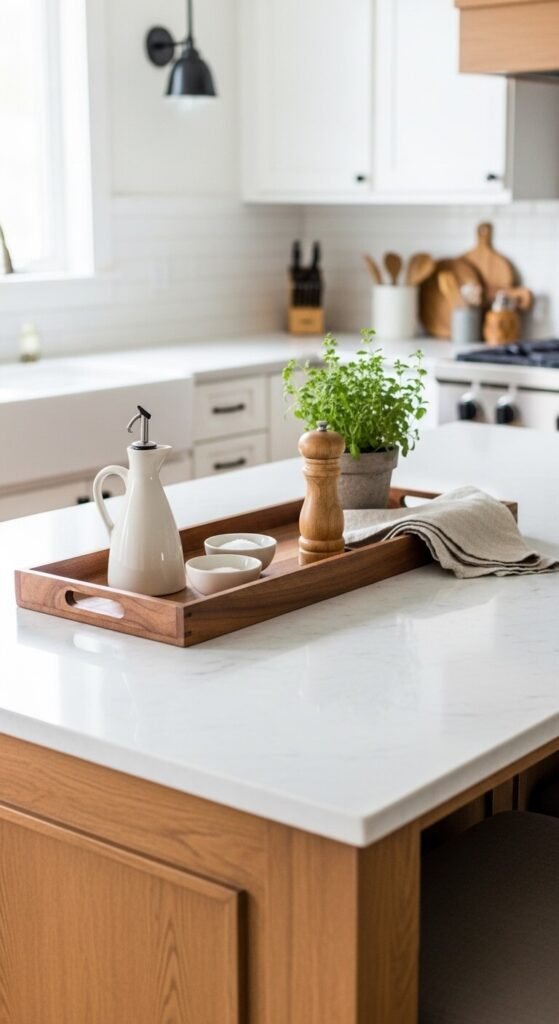 A tray on one end of a kitchen island contains the everyday cooking essentials — olive oil, salt, a small herb plant — so they are always accessible but never look scattered across the counter surface. Position the tray at the far end of the island away from the primary prep area so it does not interrupt cooking workflow. Use a long rectangular wooden or slate tray to contain four to six frequently used items. A wooden kitchen tray costs $15 to $40. The functional items inside the tray — oil, salt, herbs — serve as the decor themselves, so no additional decorative objects are needed. The tray does the organizational and aesthetic work simultaneously.