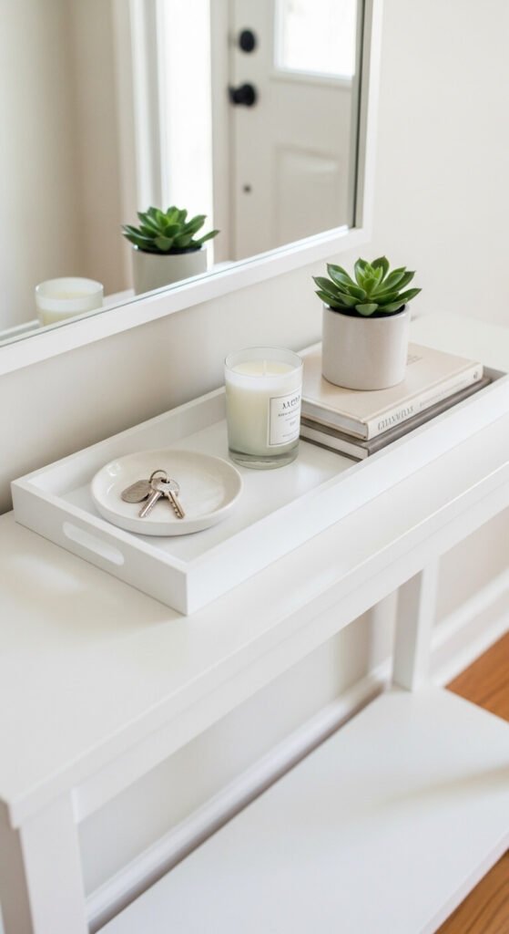 An entryway tray on a console table creates the first styled moment of a home — a contained, intentional display that communicates care and organization from the moment someone walks through the door. Include a small ceramic or leather dish inside the tray specifically for keys and small daily-carry items — this makes the tray genuinely functional rather than purely decorative. The tray also prevents the console table from becoming a dumping ground for mail, bags, and everyday clutter. A white, marble, or dark wood tray on an entryway console costs $15 to $40. Keep the total objects to four or five and include one living element — a small succulent or potted herb — for organic warmth.