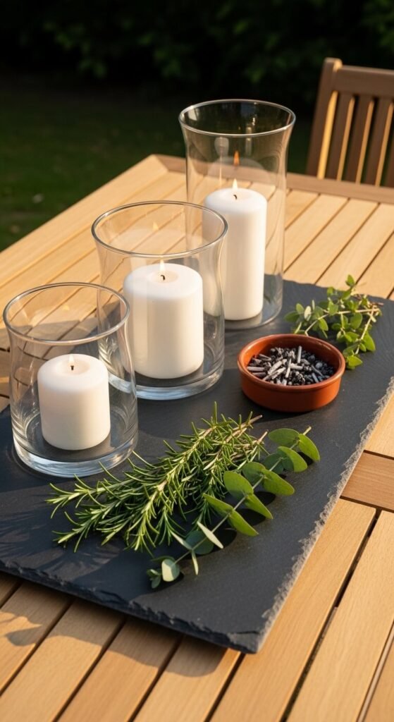 A styled tray on an outdoor dining or entertaining table creates a centerpiece that functions equally well as decoration and practicality — candles for evening light, herbs for fragrance and visual greenery, a citronella element for insect deterrence. Use a weather-resistant tray material for outdoor use — slate, teak, or powder-coated metal all withstand moisture and UV exposure far better than lacquered wood or leather. A slate serving tray costs $20 to $50. Loose herb sprigs from the garden laid directly on the tray surface add organic life for zero cost. Hurricane candle holders protect candle flames from outdoor wind and cost $5 to $15 each.