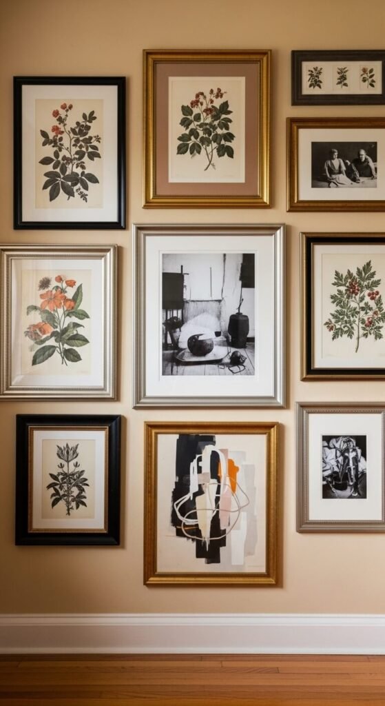A gallery wall built from mismatched vintage frames is the defining move of eclectic decor. The frames don’t match — and that’s the whole point. Look for frames at thrift stores for $1 to $8 each. Mix ornate gold frames with plain black ones, small square frames with oversized rectangular ones. Fill them with whatever holds meaning: old postcards, botanical prints, personal photos, art market finds. Lay everything out on the floor first to test the arrangement before hanging. The mix of eras and sizes is what makes it feel personal rather than showroom-styled.