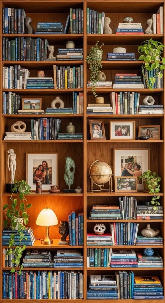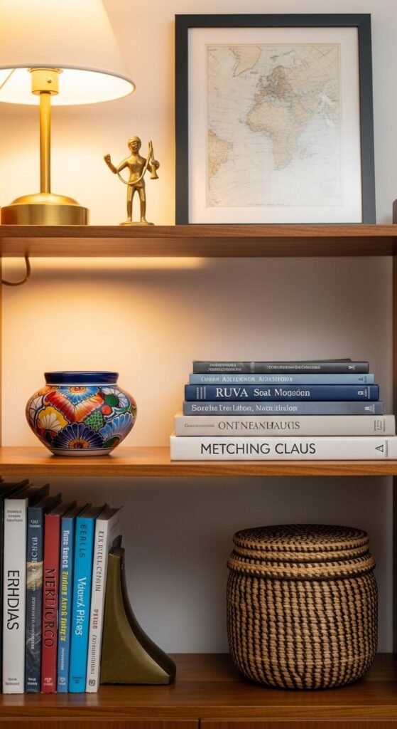 Open shelves styled with genuine travel objects tell a story no interior designer can fake. A brass figurine from a market in Marrakech, a painted bowl from Oaxaca, a woven piece from a local artisan — these objects have provenance. That’s what makes eclectic shelving feel lived-in rather than staged. Group objects in odd numbers. Mix textures — ceramic, wood, metal, textile. Add a few art books for height and color. The rule is simple: only keep objects that mean something. Meaningful things always look better than decorative filler.