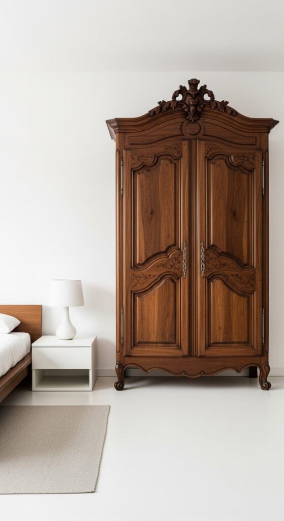 Placing an antique armoire in a modern or minimalist room creates the kind of contrast that makes both pieces more interesting. The ornate carving and dark patina of an old armoire reads even more dramatically against white walls and clean lines. Antique armoires appear at estate sales, antique markets, and online for $150 to $600 depending on condition. They work as wardrobes, linen storage, or home bars. Don’t try to match the rest of the room to the armoire — let it stand as the statement it is, surrounded by simpler pieces.