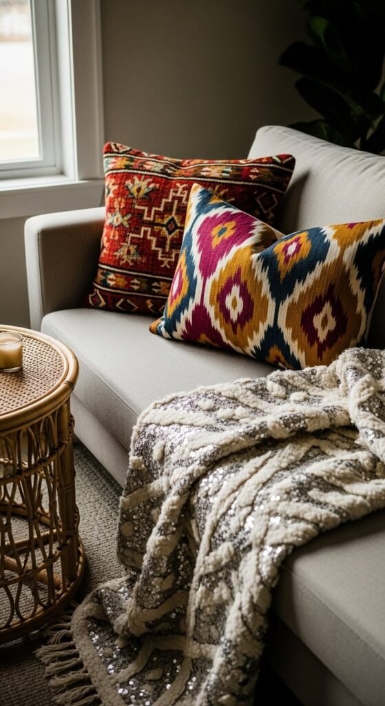 Global textiles — Moroccan wedding blankets, Indian block prints, Turkish kilims, West African kente fabric — bring pattern, color, and cultural history into a room all at once. A hand-stitched Moroccan pom-pom blanket costs $30 to $80 on Etsy from authentic sources. Block print cushion covers run $10 to $20 each. Mix two or three different textile traditions on the same sofa — the visual variety is what eclectic rooms are built on. Keep the sofa itself neutral so the textiles carry the visual weight without the room tipping into chaos.
