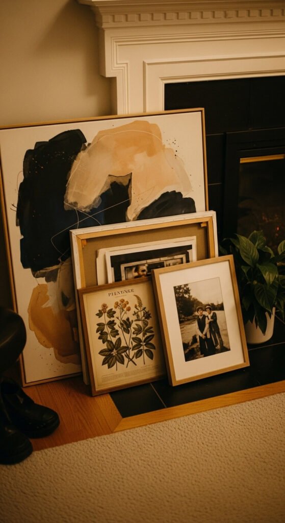 Leaning art against a wall instead of hanging it is one of the most relaxed, eclectic approaches to displaying pieces. Stack two or three frames of different sizes together — let the edges overlap. The casual arrangement feels lived-in and changeable in a way that rigidly hung art doesn’t. It also lets you swap pieces out easily without additional holes in the wall. Works best in living rooms, bedrooms, and home offices. Lean large pieces against the wall and smaller ones in front — varying heights create a natural, layered composition.