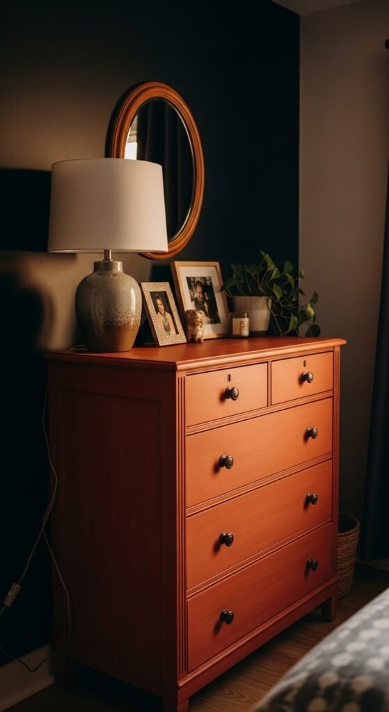 One painted furniture piece in a color that surprises is the fastest way to personalize a room. A secondhand dresser, side table, or bookshelf painted in terracotta, cobalt, sage green, or dusty blush becomes the room’s accent point. Find plain furniture at thrift stores for $10 to $40. A quart of furniture paint runs $15 to $25 and covers most small pieces with two coats. Sand lightly, apply paint, and seal with a matte topcoat. No one else has the same piece. That alone makes it a more personal choice than anything bought off a showroom floor.