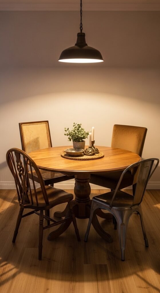 A dining table with completely mismatched chairs is one of the most inviting looks in eclectic decor. Each chair has its own history and personality, and guests naturally gravitate to the one that suits them. Collect chairs from thrift stores and estate sales for $5 to $30 each. The unifying element can be subtle — the same wood tone across three chairs, or painting the legs of all four chairs the same color to tie them together without making them match. The result is a table that looks collected over time rather than purchased as a set.