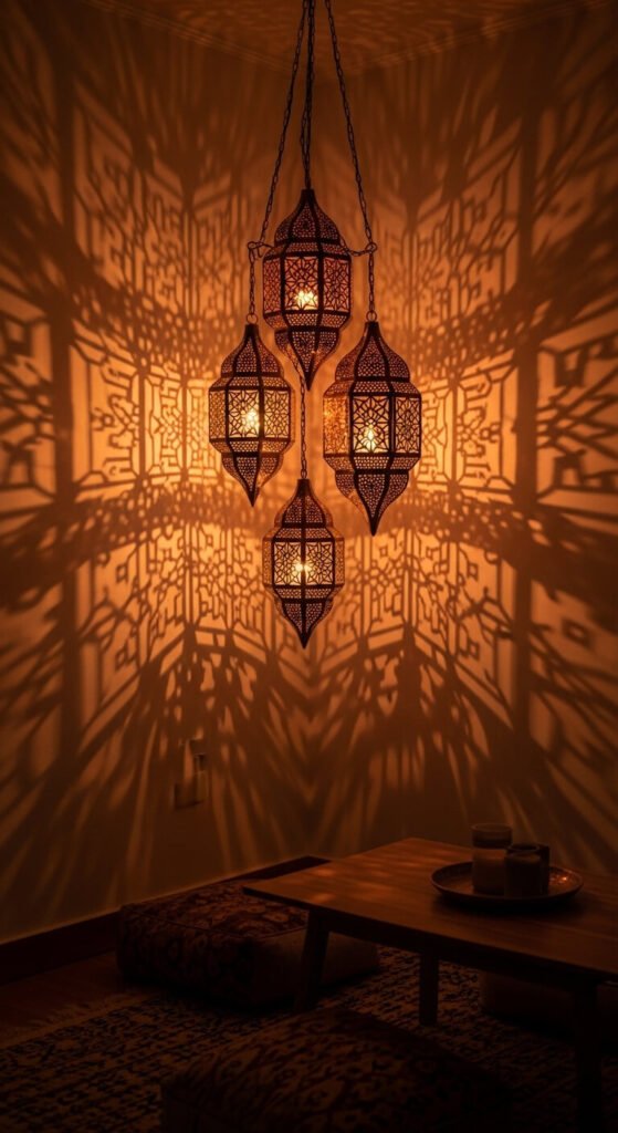 Hanging a cluster of Moroccan or Turkish pierced metal lanterns creates one of the most atmospheric lighting arrangements in any eclectic home. The cutout geometric patterns cast shadows across walls and ceilings when lit — the effect is completely unlike any standard fixture. Individual lanterns cost $15 to $40 each online or at import stores. Hang three at slightly different heights using S-hooks and ceiling hooks — no electrician required if you use battery-operated candles inside. Group them in odd numbers near a reading corner, dining area, or entryway for maximum visual drama.