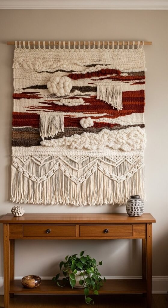 A large woven wall hanging fills vertical space with texture and warmth in a way that framed art alone can’t. Hand-woven fiber pieces in natural cotton, wool, and jute add depth through material rather than color. Look for weavings on Etsy from independent artists for $40 to $150 depending on size. Or make your own on a simple cardboard loom for $10 to $20 in yarn and supplies. Hang one large piece rather than several small ones — a single generous weaving reads as a considered design choice rather than filler for a bare wall.