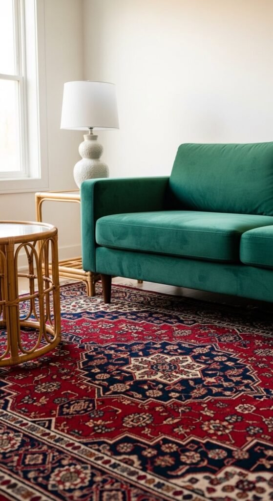 A bold velvet sofa paired with a patterned rug is a classic eclectic power move. The key is letting both items be strong — don’t neutralize one to accommodate the other. Jewel tones work best: emerald, sapphire, mustard, or burnt orange. Look for secondhand velvet sofas on Facebook Marketplace for $100 to $400. Vintage Persian or kilim rugs appear regularly at estate sales and antique markets for $50 to $200. The textures — soft velvet against flat woven pattern — are what make the combination work rather than clash.