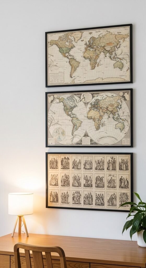 Vintage maps and antique documents make some of the best wall art available — and they’re often free or very cheap. Download historical maps, old botanical illustrations, and antique engravings from free archives like the David Rumsey Map Collection, the Library of Congress digital archive, and Rawpixel’s public domain section. Print at a local print shop for $5 to $15 per piece. Frame in simple thin frames. Large antique maps — printed at 24×36 inches — make a bold statement in hallways, offices, and dining rooms for a fraction of what art galleries charge.