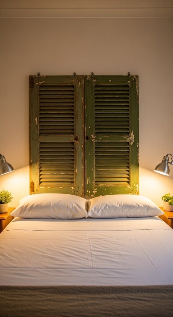A headboard built from repurposed architectural salvage is the most eclectic bedroom upgrade available. Old shutters, a vintage door, a window frame, or a section of decorative wrought iron gate — all of these work as headboards when mounted to the wall behind the bed. Find architectural salvage at reclaim yards and antique dealers for $20 to $100. Mount flush to the wall using picture-hanging hardware or simple screws. The aged paint and worn material of salvaged pieces adds a layer of history to the bedroom that no manufactured headboard can replicate.