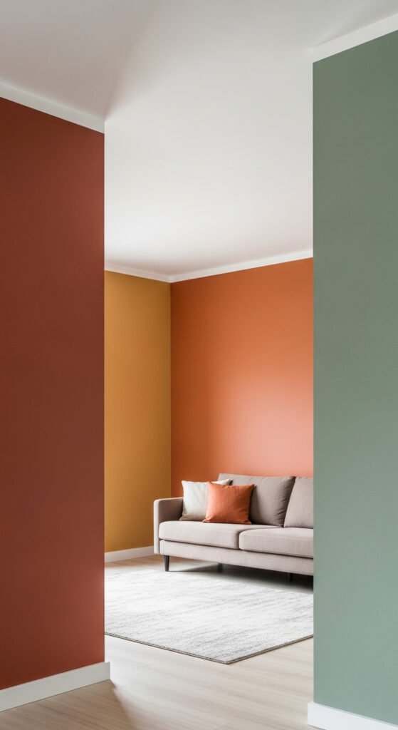 Color blocking across multiple walls — each wall a different but related color — is an eclectic move that takes confidence. Choose three colors from the same warm or cool family and assign each wall its own shade. Terracotta, ochre, and sage green work together. Deep teal, navy, and charcoal work together. Use one quart per wall — $15 to $25 each — and keep the ceiling and trim white to anchor the composition. The furniture stays neutral. This is about the architecture of color rather than pattern or texture, and it makes the room look like it came from someone with a very particular eye.