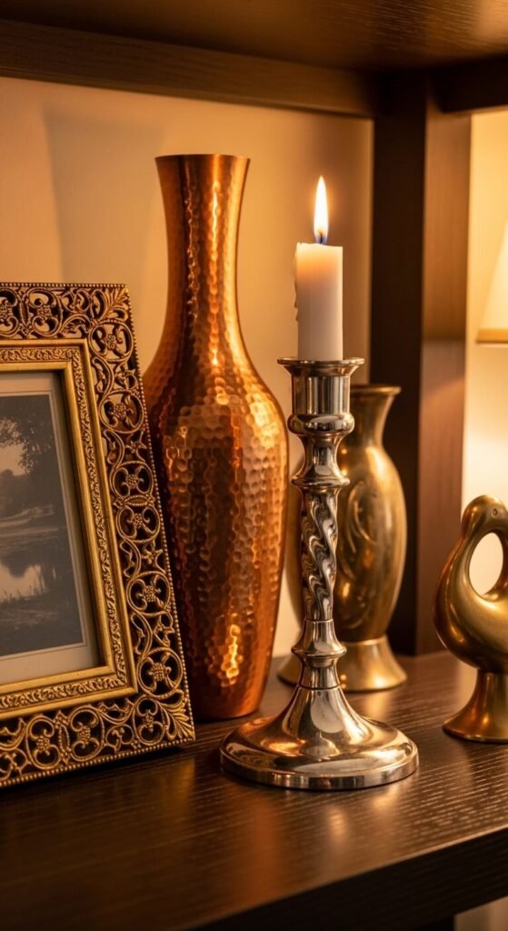 The old rule of matching all your metals is completely ignored in eclectic decor — and that’s a good thing. Gold, brass, copper, and silver together on the same shelf or in the same room adds depth that a single-metal scheme never achieves. Thrift stores are full of mixed-metal candlesticks, frames, and vessels for $2 to $15 each. The key is keeping the scale varied — a tall brass vase beside a small silver dish beside a low copper bowl. Different heights and sizes prevent the arrangement from looking cluttered rather than collected.