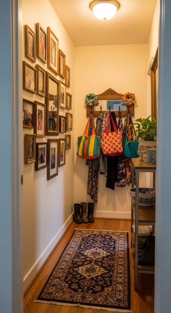 The entryway is the first room anyone sees — make it tell your story immediately. In eclectic homes, the entryway doesn’t follow a neutral, welcoming template. It’s already opinionated. A gallery of real family photos in mismatched thrifted frames. A vintage coat rack loaded with personality. A patterned runner that has nothing to do with what’s in the next room. A bold color on the entryway walls sets expectations before anyone sees anything else. Total cost for a complete eclectic entryway refresh: $30 to $80 if you shop secondhand and use what you already own.