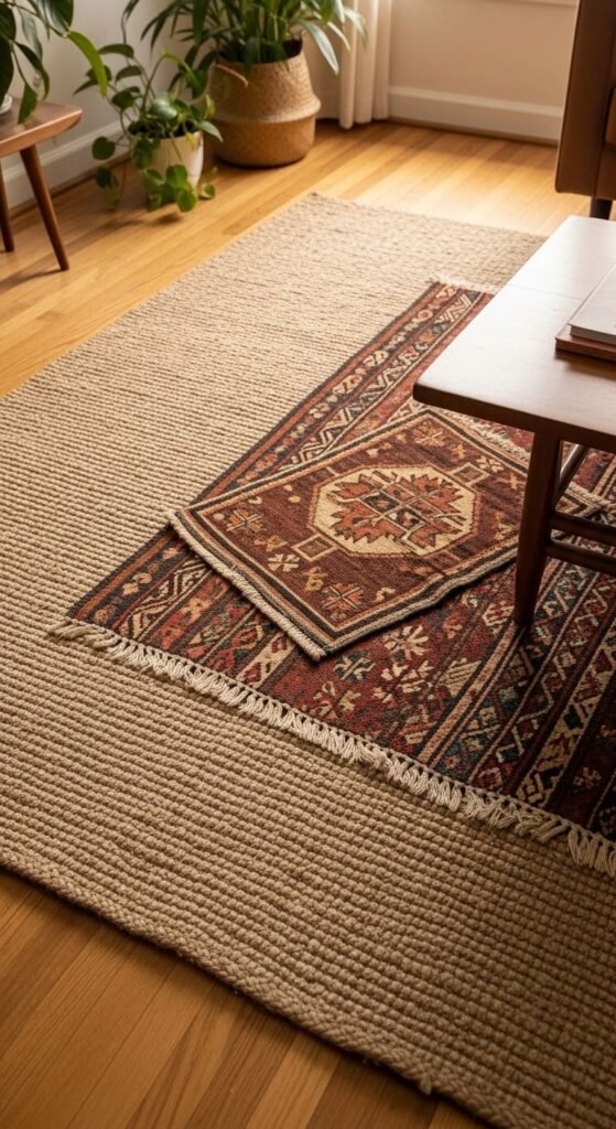 Layering two rugs creates depth and collected character that a single rug never achieves. Use a large, neutral base — natural jute or a plain sisal — and layer a smaller, patterned vintage rug on top. The base rug grounds the space while the top rug adds personality. Jute base rugs run $40 to $80 for a 5×7. A vintage kilim or patterned overlay costs $30 to $100 at thrift stores, markets, or online. Lay the top rug slightly off-center or at an angle — perfectly straight looks overly controlled for eclectic style.