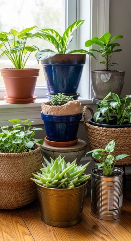 Eclectic plant styling means letting every pot be different. Glazed cerulean blue next to raw terracotta next to a woven basket planter — the variety is the look. Don’t buy matching sets. Collect pots from thrift stores ($1 to $5 each), garden centers, import stores, and market stalls. A painted terracotta pot you make yourself costs under $3 in materials. Group plants together in clusters of odd numbers — three or five — rather than lining them up evenly. Different heights, different textures, different colors all in one arrangement reads as intentionally eclectic rather than accidental.