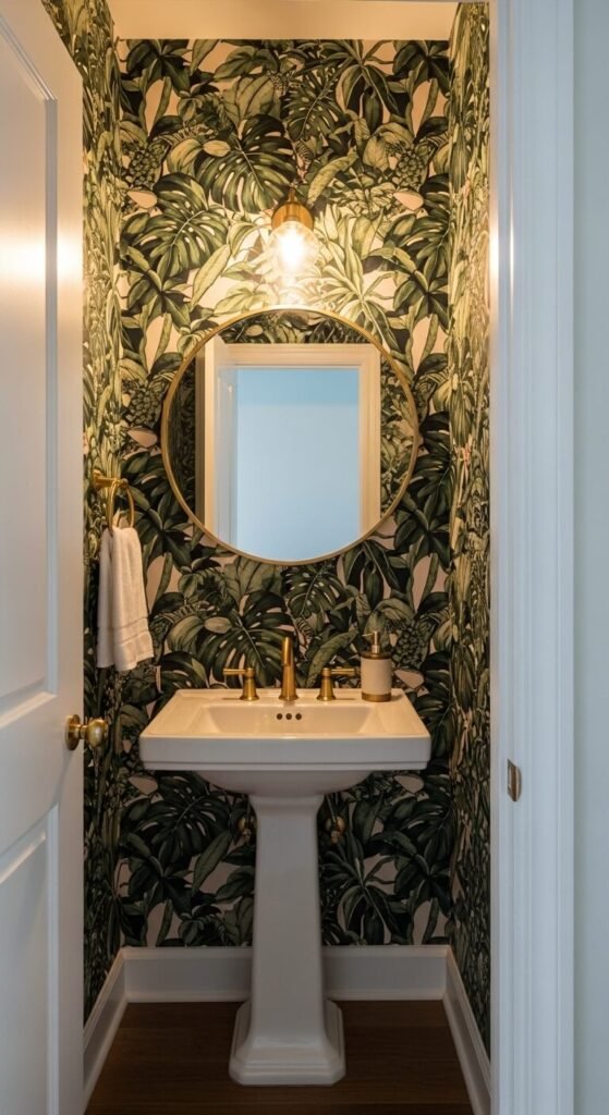 One boldly wallpapered room — especially a small one — is a signature eclectic move. A powder bathroom or entryway is the perfect place to go loud with pattern because the room is small and people only pass through it. Wallpaper for a small bathroom runs $50 to $150 for the full room. Peel-and-stick options are renter-friendly and cost about the same. Choose something you genuinely love — an oversized botanical, a bold geometric, a hand-painted chinoiserie pattern. Small rooms can hold big patterns in a way that larger rooms often can’t.