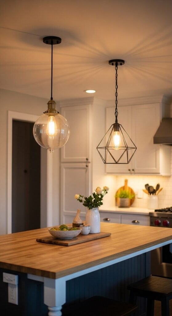 Mixing vintage and modern light fixtures in the same room is a distinctly eclectic approach to lighting. A 1960s glass schoolhouse pendant beside a contemporary black cage light — different decades, different design languages — works when both share similar warmth and scale. Vintage fixtures appear at antique stores, estate sales, and online for $20 to $80. Rewiring is straightforward for an electrician or handy DIYer. Don’t feel obligated to match. Two different fixtures above a kitchen island or dining table say more about personal taste than a matching set ever could.